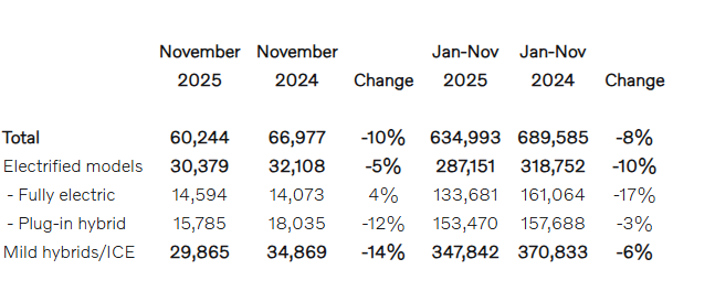 近日,沃尔沃汽车发布公告称,2025年11月全球汽车销量为60244辆,同比下滑10%;纯电动汽车销量同比增长4%至14594辆;插电式混动车销量同比减少12%至15785辆。今年1-11月,沃尔沃累计销量为63.5万辆,同比下降8%。