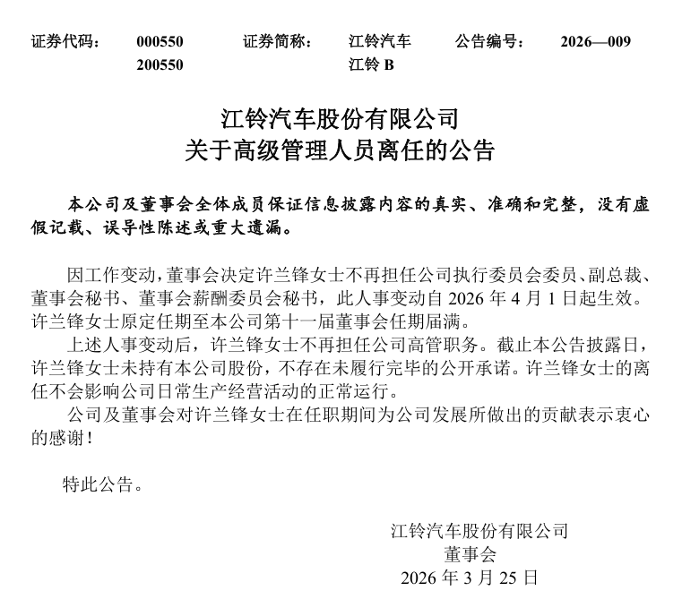 猫头鹰车志(ID:owlauto)讯,据江铃汽车股份有限公司(下称“江铃汽车”)发布的公告,经董事会审议通过,因工作变动原因,许兰锋不再担任执行委员会委员、副总裁、董事会秘书、董事会薪酬委员会秘书四项职务,此次人事调整自2026年4月1日起正式生效;许兰锋原定任期至第十一届董事会任期届满,离任后将不再担任江铃汽车任何高管职务。