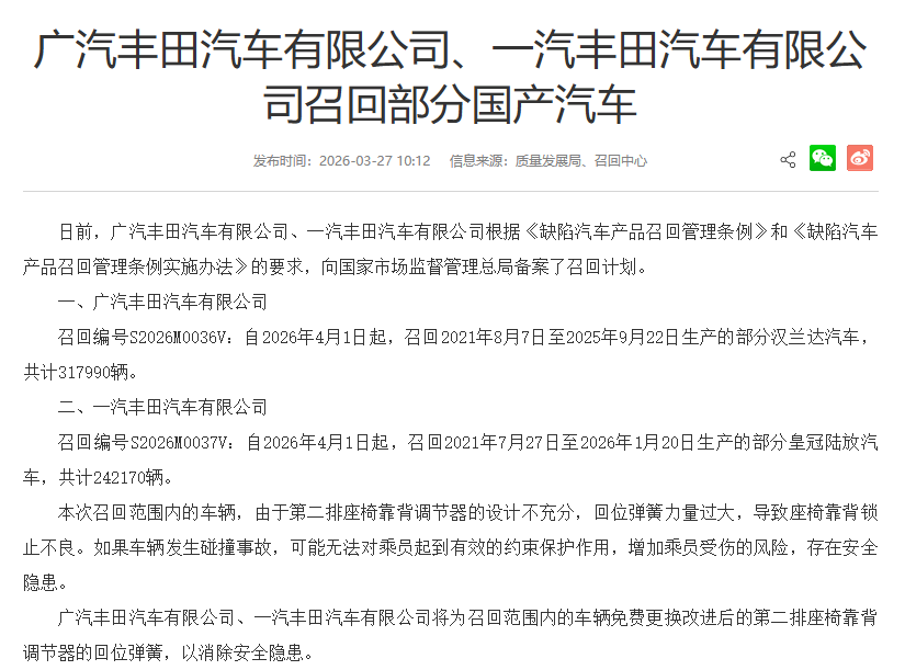 猫头鹰车志(ID:owlauto)讯,据国家市场监督管理局发布的召回公告,广汽丰田汽车有限公司、一汽丰田汽车有限公司已完成召回备案,自2026年4月1日起,对旗下存在安全隐患的国产车型实施召回,两家企业本次召回车辆总数达560160辆。