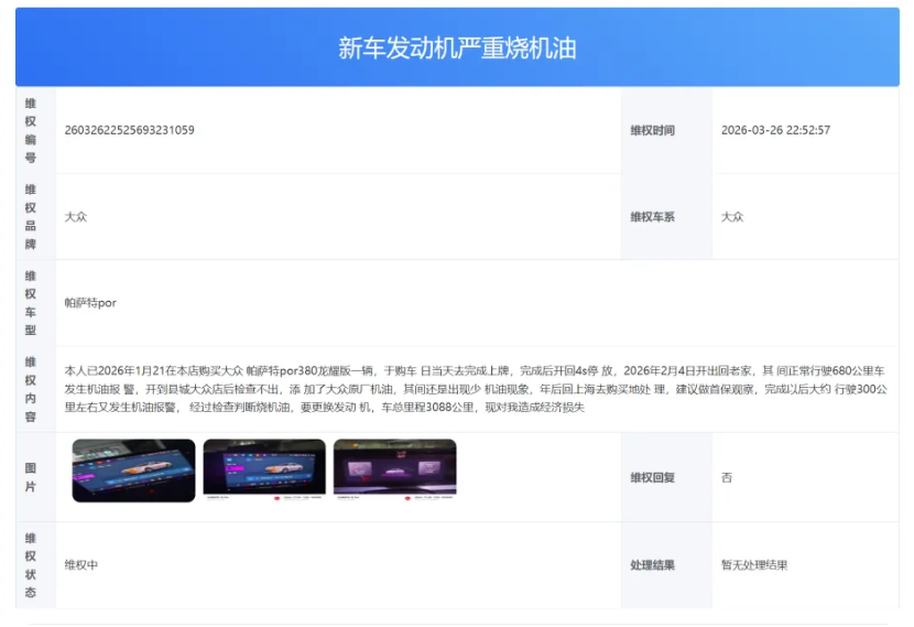 曹先生于2026年1月13日在上海某上汽大众4S店购买了这款新车,裸车价20.59万元。据其描述,车辆在2026年1月22日首次出现机油报警,当时行驶里程仅为2500公里左右,尚未到首保时间。春节期间,曹先生只能频繁自行添加机油维持车辆运行,这让他对新车质量产生了严重质疑。