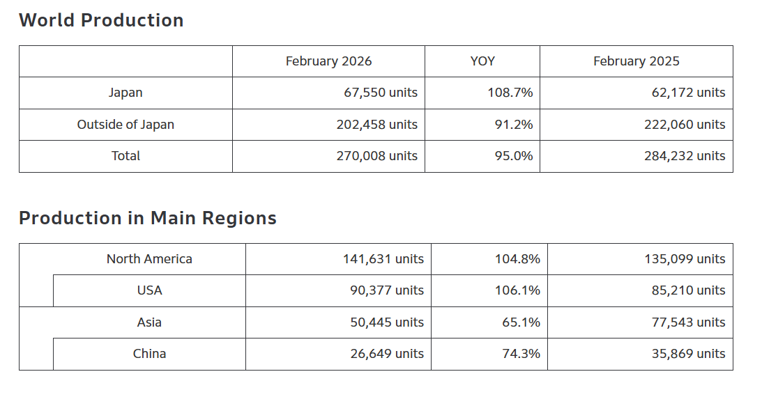 北美地区成为本田海外生产的重要支撑,2月产量达141,631辆,同比增长4.8%,其中美国工厂贡献90,377辆,同比增长6.1%。
