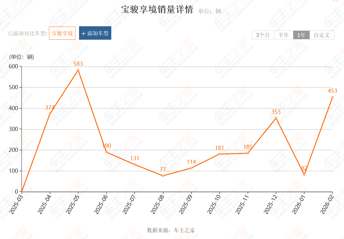 2025年4月上海车展期间,宝骏享境正式上市,一年过去,其销量表现却并不尽人意,月销量始终在三位数左右徘徊,2026年1月甚至跌到了82辆,最高月销表现也没有超过600辆。