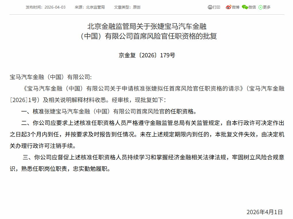 猫头鹰车志(ID:owlauto)讯,根据国家金融监督管理总局北京监管局发布的批复,张婕已正式获得宝马汽车金融(中国)有限公司首席风险官任职资格,该批复自发布之日起生效。
