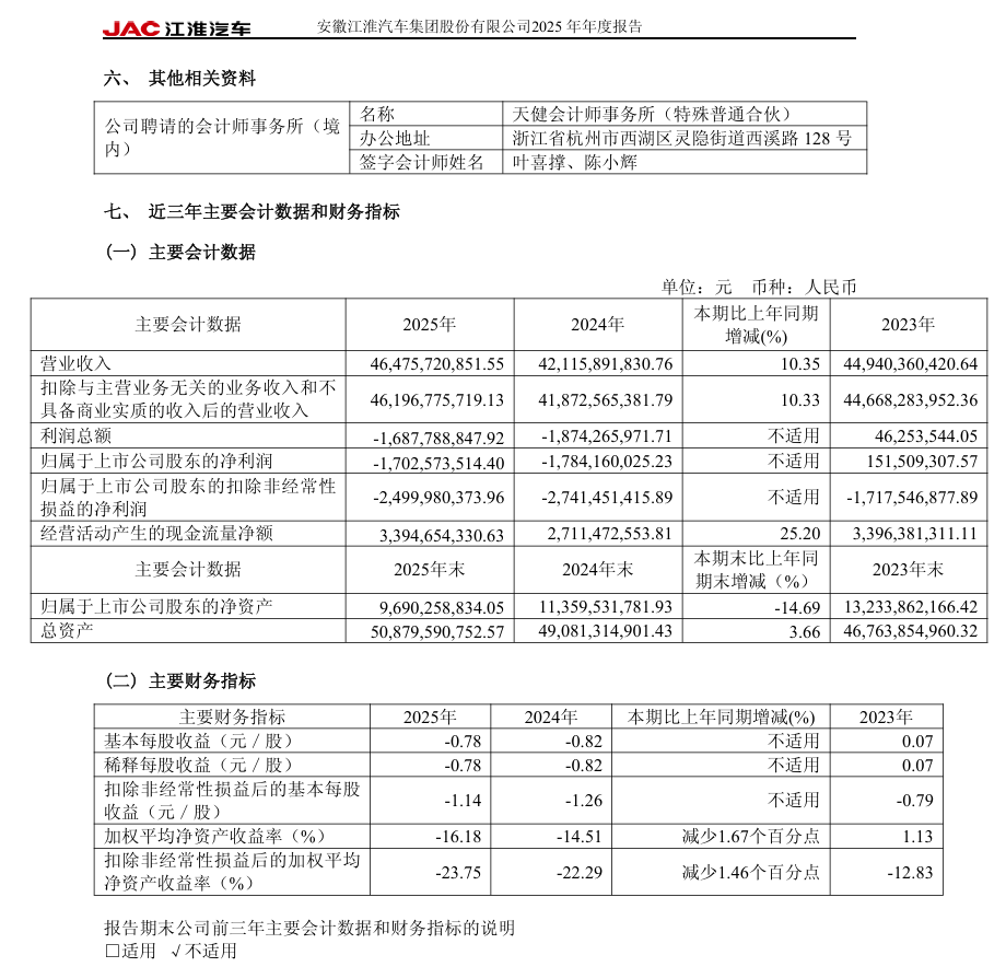 猫头鹰车志(ID:owlauto)讯,近日,江淮汽车2025年年度报告显示,2025年实现营业收入464.76亿元,同比增长10.35%;实现归属于上市公司股东的净利润为-17.03亿元,较上年同期的-17.84亿元增长4.57%,亏损幅度有所收窄;实现扣除非经常性损益后的净利润为-25.00亿元,同比增长8.81%;经营活动产生的现金流量净额为33.95亿元,同比增长25.20%。