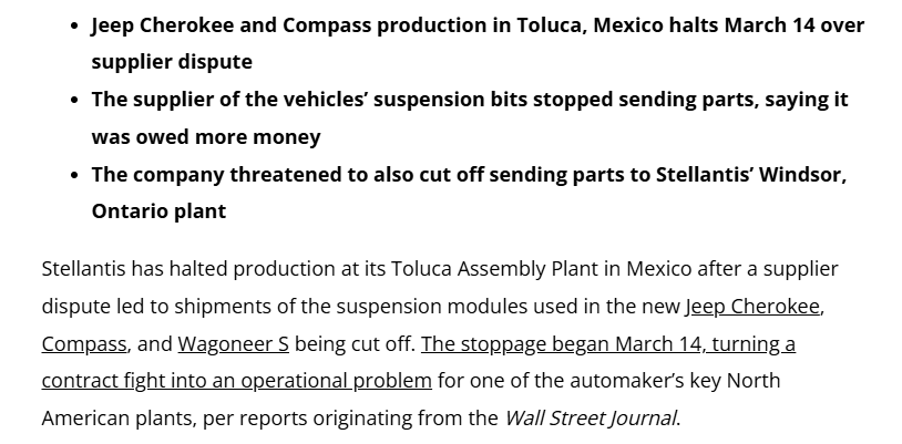猫头鹰车志(ID:owlauto)讯,近日,据媒体报道,全球第四大车企Stellantis与零部件供应商采埃孚底盘模块公司(ZF Chassis Modules)的付款纠纷持续发酵,导致其位于墨西哥托卢卡(Toluca)的工厂自3月14日起停产已近一个月,Jeep Cherokee、Jeep Compass及电动版Jeep Wagoneer S等多款主力车型生产受阻。