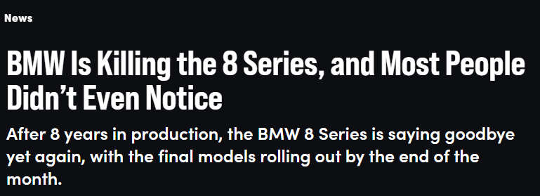 猫头鹰车志(ID:owlauto)讯,近日,据媒体报道,宝马公司正式确认,旗下8系(G14/G15/G16)车型将于2026年4月底前在德国丁戈尔芬工厂停止生产,且目前无任何推出继任车型的计划,这也是宝马历史上第二次停产8系。