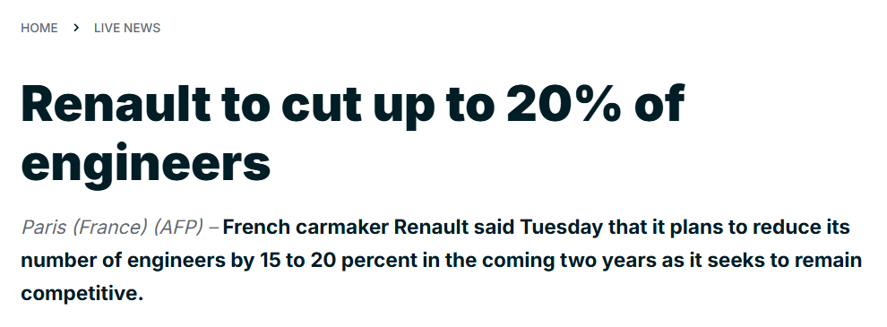 猫头鹰车志(ID:owlauto)讯,近日,据媒体报道,法国汽车制造商雷诺集团(Renault SA)计划在未来两年内裁减全球15%—20%的工程技术人员,以提升公司灵活性并有效应对来自中国低成本车企的激烈竞争。
