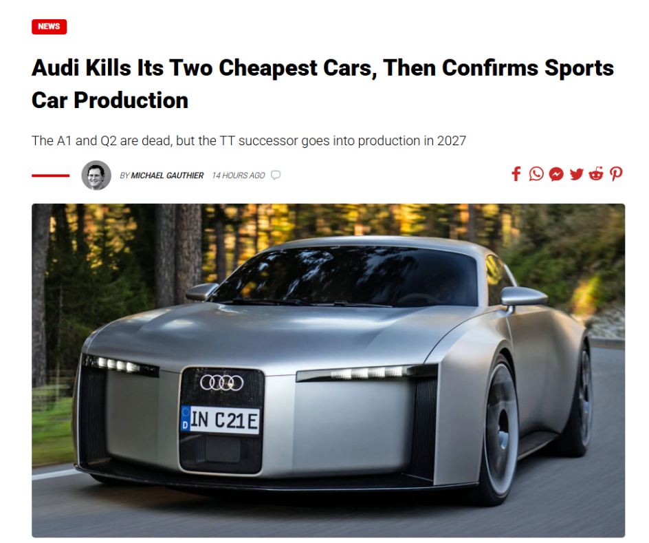 奥迪全球CEO格尔诺特・多尔纳此前声明,停产决定源于多重战略考量,除排放与市场因素外,小型车利润空间远低于中大型豪华车型,资源优化配置成为必然选择。