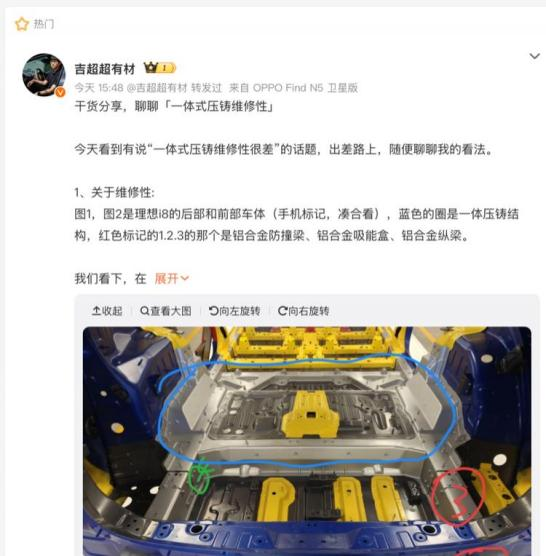 魏建军此番言论一出,迅速引发关注。理想汽车材料技术负责人“吉超超有材”随即在社交平台发表不同看法。他以理想i8为例,详细解释了一体化压铸在碰撞工况下的表现。在正面和尾部碰撞时,一体式压铸结构并非处于碰撞第一线,至少有三层保护设计,包括防撞梁、吸能盒和纵梁,它们依次吸收能量,抵抗变形。一般低速碰撞最多损伤防撞梁,可直接更换;碰撞能量较高时,损伤吸能盒和纵梁也能整体更换,维修经济性较好,不存在“轻轻一碰、马上换车”的情况。他还介绍了一体化压铸的优势,如车身更轻质,可提升续航和能耗;更集成,生产效率高;有利于提升车身刚度,进而提升操控性和舒适性。同时,他也承认一体化压铸存在零件成本高、模具开发周期长、工艺质量控制难、严重碰撞时维修比钣金困难等劣势,但认为国内不用一体压铸主要原因是成本,而非维修性。
