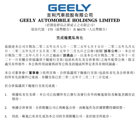 猫头鹰车志讯(ID:owlauto),近日,吉利汽车控股有限公司(以下简称“吉利汽车”)发布公告,宣布已正式完成对极氪智能科技控股有限公司(以下简称“极氪”)的私有化及合并交易。至此,极氪成为吉利汽车的全资附属公司,并从纽交所退市。