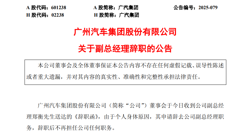 猫头鹰车志讯(ID:owlauto),近日,广州汽车集团股份有限公司(以下简称“广汽集团”)发布了一则重要人事变动公告,郑衡因个人身体原因,申请辞去副总经理职务,该辞职申请将于2025年12月23日正式生效,而其原定任期到期日为2028年3月27日。广汽集团明确表示,郑衡辞职后不再担任该公司任何职务,且其离任不会对广汽集团的正常生产经营造成影响。