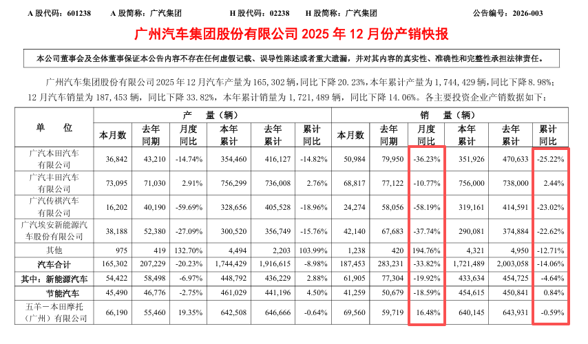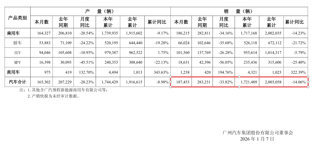 猫头鹰车志(ID:owlauto)讯,1月7日晚间,广汽集团发布2025年12月产销公告,数据显示,广汽集团2025年12月销量承压明显,当月汽车销量为18.75万辆,同比下降33.82%;产量为16.53万辆,同比下滑20.23%。广汽集团2025年全年产销均呈负增长态势,累计销量为172.15万辆,同比下降14.06%;累计产量为174.44万辆,同比下降8.98%。