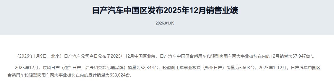 猫头鹰车志(ID:owlauto)讯,日产中国公布的2025年全年销量数据显示,其在中国市场含乘用车和轻型商用车在内的累计销量为653024辆,同比下滑6.26%,日产中国销量已连续7年下滑。