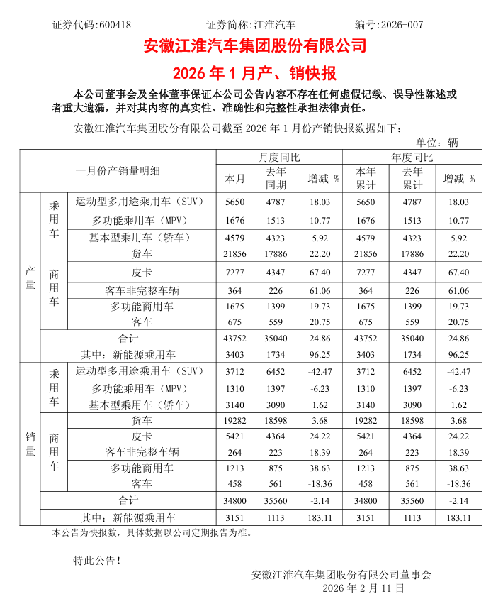 产销快报显示,江淮汽车1月总产量达43752辆,同比增长24.86%;整体销量为34800辆,较2025年同期的35560辆微降2.14%。其中,最亮眼的表现来自新能源乘用车板块,当月销量达3151辆,同比暴涨183.11%;产量同比增长96.25%至3403辆。产销双向发力,成为拉动江淮汽车增长的核心引擎,彰显出其在新能源转型领域的显著成效。