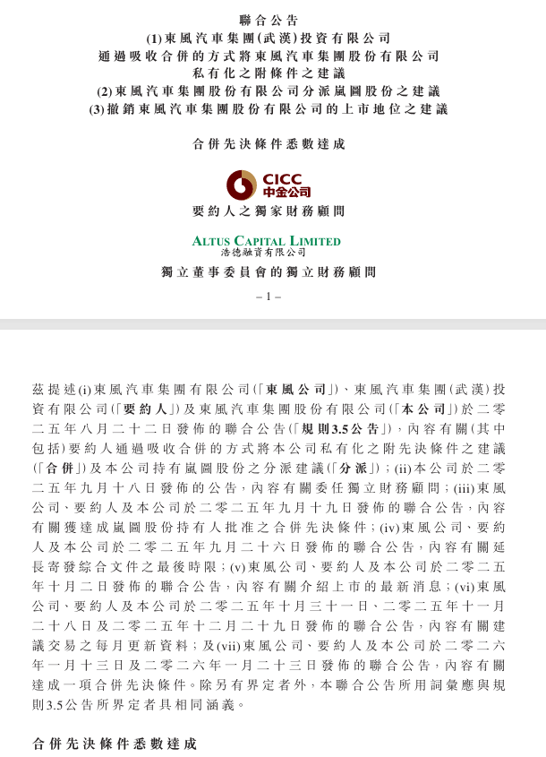 东风集团股份私有化迈出关键一步 合并先决条件悉数达成